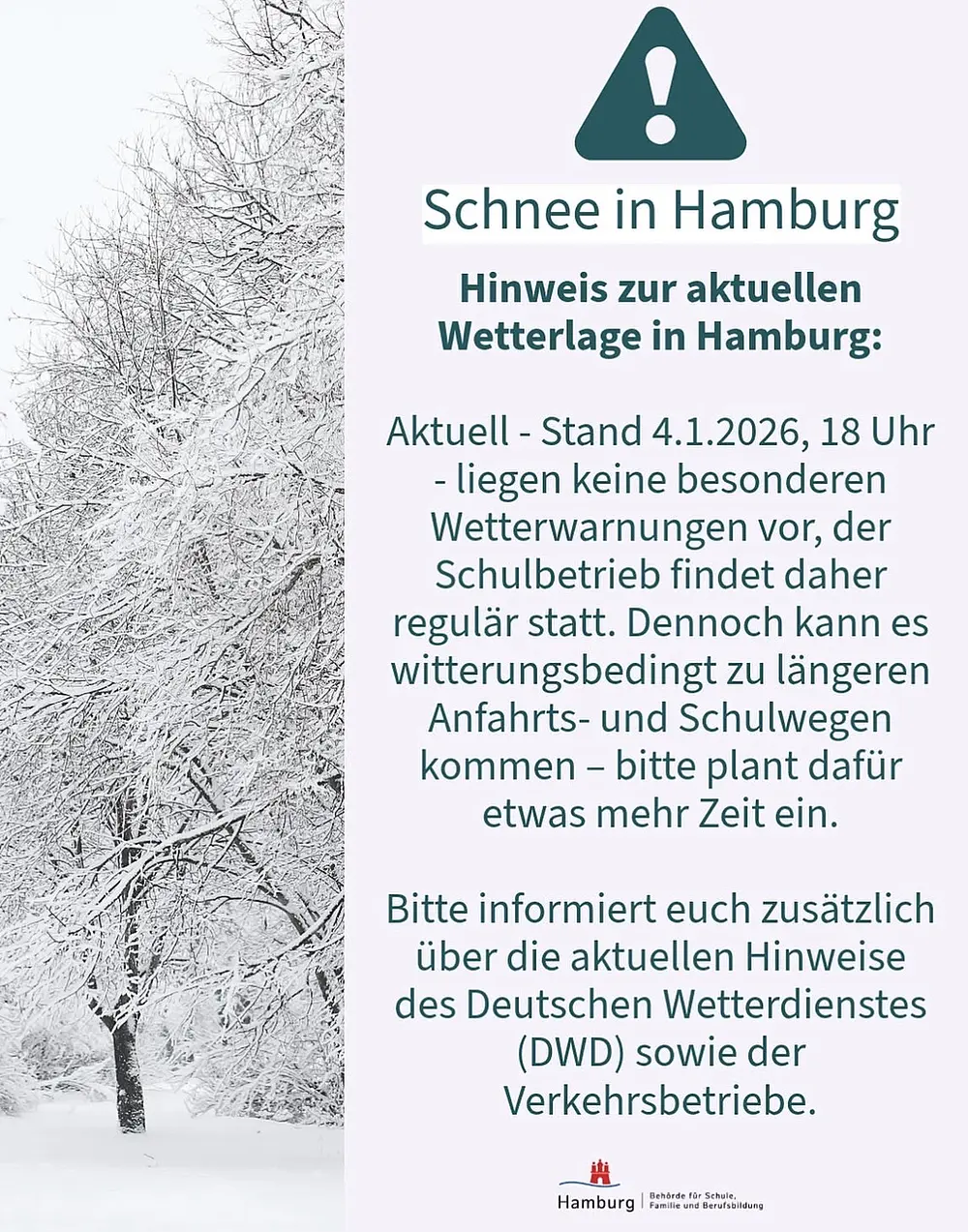 Die Schulbehörde gibt für den morgigen Start (05.01.26) nach den Schulferien jedoch Entwarnung: Die Wetterlage hat sich etwas beruhigt, sodass der Schulbetrieb regulär stattfindet.